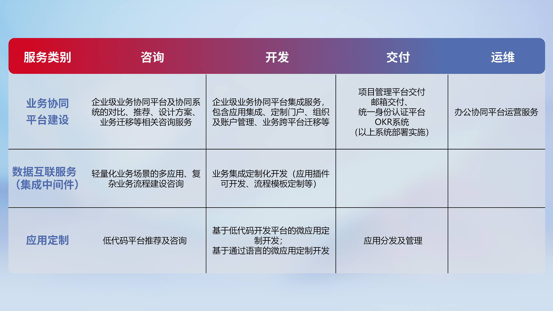 针对钉钉、、企微、、、、IDaas等平台级产品提供产品的规划、、、、方案、、、、交付、、、定制化开发等服务,,实现如统一协同办公、、、、智能客户服务、、混合会议管理、、、、智能数据查询、、等业务场景,,实现数字化转型。。