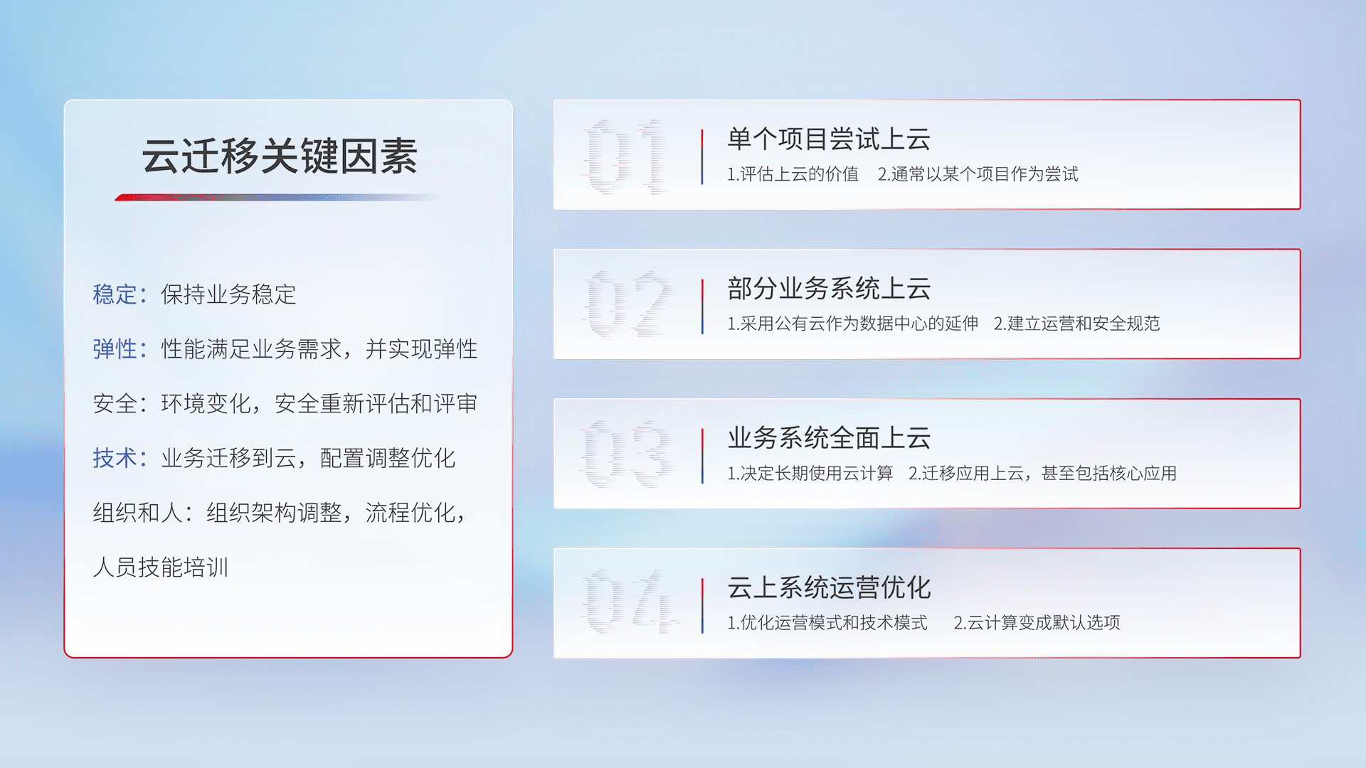 结合实际业务,,,,从规划设计、、、云平台选型、、云原生改造、、、数据迁移、、、集成交付,,,迁移全过程为客户识别最佳上云路径,,,做好风险识别管理,,设计网络架构、、、、身份权限、、、、安全审计合规、、、、操作审计、、、、日志审计、、、监控告警策略、、、多站点容灾设计等,,,对云上基础设施进行整体规划,,,,提升IT治理水平,,,以满足弹性、、、高可用、、、、高性能的需求。。。